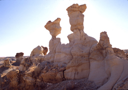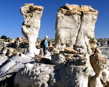 Formation Name: FRUITLAND Rock Type(s): Conglomerates, Sandstone, Siltstone, Shale, Coal Geologic Time Period: END OF CRETACEOUS Time of Deposition (in millions of years ago): 75 to 73 Depositional Environment: wetlands, swamps, river deltas along a sea retreating to the northeast Common Fossils Found: Petrified wood, crocodiles, turtles, very early mammals, dinosaurs (e.g., Pentaceratops - unique to San Juan Basin- and duck-billed Hadrosaurs) Formation Name: KIRTLAND Rock Type(s): Mostly Siltstone Geologic Time Period: END OF CRETACEOUS Time of Deposition (in millions of years ago): 73 to 70 Depositional Environment: wetlands, swamps, river deltas inland from a sea retreating to the northeast Common Fossils Found: Petrified wood, fish scales, dinosaurs (e.g., T. Rex and last of the sauropods: Allamosaurus) Formation Name: OJO ALAMO Rock Type(s): Mostly Sandstone Geologic Time Period: TERTIARY— EARLY PALEOCENE Time of Deposition (in millions of years ago): 66 to 65 ?, 65 to 64 ? Depositional Environment: Continental – rivers and streams Common Fossils Found: Flowering plant species Formation Name: NACIMIENTO Rock Type(s): Sandstone alternating with Siltstone and Shale Geologic Time Period: TERTIARY-- MIDDLE PALEOCENE Time of Deposition (in millions of years ago): 65?,64? to 58 Depositional Environment: Branching river systems and large flood plains Common Fossils Found: petrified wood, fish scales, early mammals (e.g., primates, dog-sized early hoofed varieties) Paleontologists are particularly interested in the De Na Zin Wilderness. It’s one of the rare places on earth where they can study a terrestrial fossil record spanning the 65 million year old Cretaceous-Tertiary boundary marking the demise of a 150 million year long dinosaur dynasty and the beginning of mammalian rule. The extensive lower elevation De Na Zin areas are carved from the Kirkland/Fruitland formation like the neighboring Bisti and AhShe Sle Pah badlands. But the De Na Zin’s upper areas lie in the Ojo Alamo and Nacimiento formations, adding further diversity to the doo doos. The Nacimiento formation’s erosion resistant sandstone mesa edges add relief, picturesque arches and large scale sandstone hoo doos to the mix. Petrified wood is very plentiful, including some of the largest petrified logs in the San Juan Basin, many of which actually form hoo doo and even arch tops. Higher still, thick layers of dark red and bronze sandstone form massive, crenalated hoo doos and fractured mesa edges guarding a sprawling, multi-level box canyon maze. DE NA ZIN DIRECTIONS — The badlands can be accessed from either NM highway 371 or US 550 via county road 7500. The marked parking area lies about midway (12 miles) between these two routes. The badlands are north of the road. The marked turnoff east onto 7500 from NM 371 is about 40 miles south of Farmington. The turnoff west from US 550 onto 7500 is at the Huerfano Trading Post about 15 miles south from Bloomfield. MORE INFO: Call Recreation Specialist Rich Simmons at the Farmington Area BLM Office—505-599-8900 |