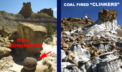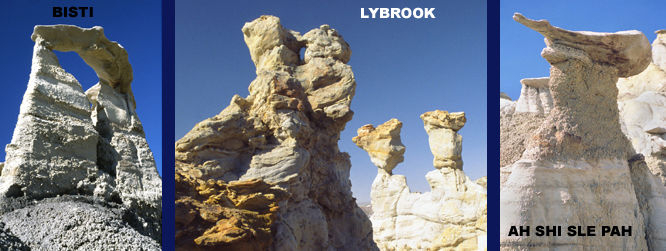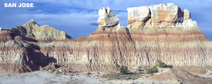 SAN JUAN BASIN FORMATIONS: SLICES OF GEOLOGIC TIME A named formation (distinguishable layer) is the basic unit or chapter in a paleoecology biography. Geologists define a formation as a recognizable, mapped rock layer with fairly widespread surface exposure that corresponds to a specific slice of geologic time. Rock types might vary at different geographic locations within the same formation but deposition times must match. Identical fossils occurring at different locales within a formation are one way to help establish dates. There is often additional sequential diversity in the rock types within a formation even at the same locale. These recognizable sub layers or members give formations their banded appearance. They correspond to different rock types, which in turn reflect changes in depositional environments within the larger context of the formation’s time span as a whole. A repeating banded pattern for example suggests very long range cyclical conditions. Erosion resistant sandstone layers alternating with weaker siltstone and shale create the stair step topography that adds intricacy and drama in some badlands. Sedimentary rocks can be modified significantly, long after their initial deposition and rock forming processes. Full-fledged metamorphosis occurs when intense heat and pressure transform original rock into something else. Classic examples are limestone turning into marble and sandstone into quartzite. No large scale metamorphosis happened within the San Juan Basin. However several badlands have widespread layers where ancient underground coal fires turned surrounding rocks into hard, brittle ceramic like materials which geologists call “clinkers.” More subtle rock modifications can occur from pressure, or from subsequent chemical alterations caused by ground water minerals interacting with copious organic matter that was always present throughout the basin’s history. Together these effects can produce various types of localized, erosion resistant, often uniquely colored and shaped bodies known as concretions. Concretions help supply materials for the weirdly shaped cap rocks which are the essence of hoo doos. Ancient soil profiles cemented by quartz-like silica into erosion resistant stone layers called silcretes are also plentiful in the Nacimiento formation and provide still more materials for cap rocks. |