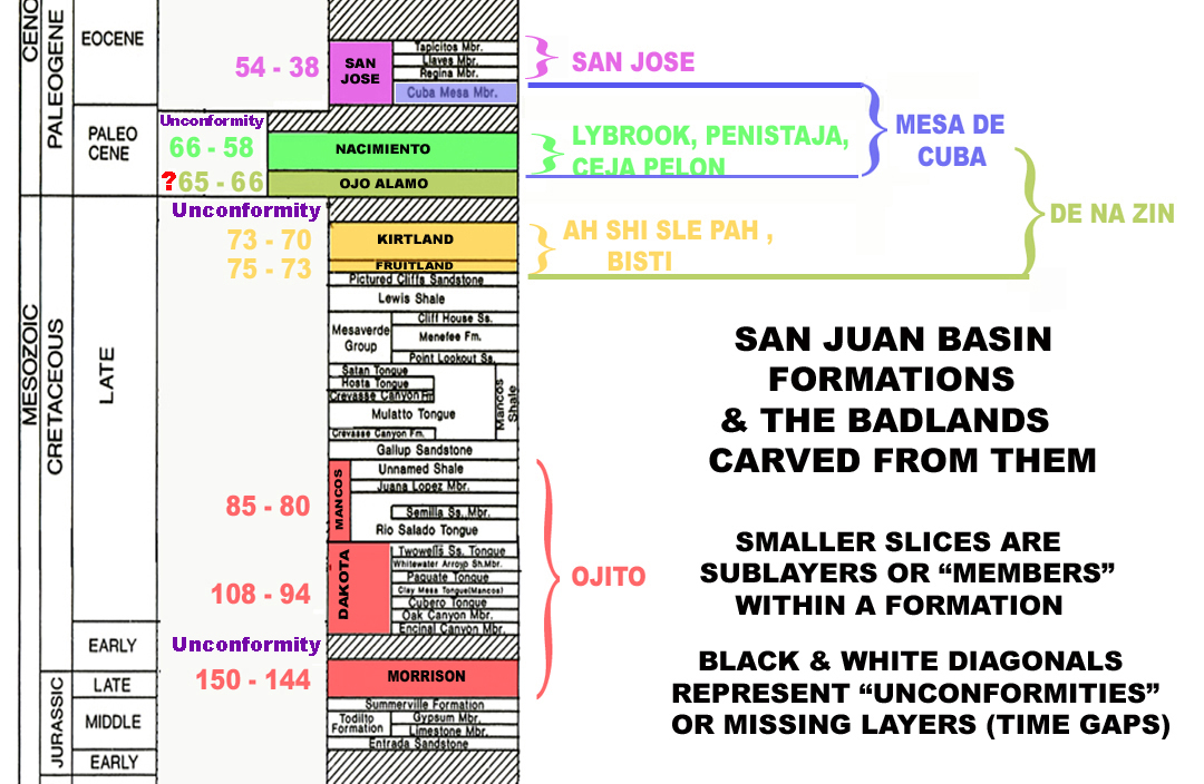 Formation Name: NACIMIENTO Rock Type(s): Sandstone alternating with Siltstone and Shale Geologic Time Period: TERTIARY-- MIDDLE PALEOCENE Time of Deposition (in millions of years ago): 65?, 64? to 58 Depositional Environment: Branching river systems and large flood plains Common Fossils Found: petrified wood, fish scales, early mammals (e.g., primates, dog-sized early hoofed varieties) The Lybrook Badlands are the largest of the Nacimiento formation badlands dropping over 700 feet in 3 distinct, multi-colored, intricately eroded stair steps. Extensive vertical relief and towering buttes lend grandeur reminiscent of Bryce Canyon. These rarely visited but highly accessible badlands rival the well known Bisti Wilderness in size and surpass it in the diversity of both hoodoos and vegetation. Ancient Juniper roots claw at naked cliff edges anchoring huge sinuous trunks which flow and curve like the finely drawn sandstone layers from which they grow. Forests of twisting, branching bonsai ponderosa clutch at jagged mesa walls. The endless Lybrook hoodoos feature precariously balanced, brilliant red cap rocks so ingenious looking that it’s difficult to believe they’ve been created by the random interactions of natural forces instead of in a Santa Fe sculpture studio. LYBROOK DIRECTIONS -- Lybrook Village lies about 35 miles northwest from Cuba or 50 miles south of Bloomfield on US 550. The badlands turnoff off 550 is about .7 miles north of the Lybrook Mercantile Store. Turn left onto the dirt route and travel south about 1.5 miles to a small road branching right. Take it for 50 yards to a junction. You have two choices here depending on which section of the badlands you want to access. Turn left for a half mile route to the parking area. Then head for the cliff edge and find the tricky way down or turn right and continue for 2 miles past another junction to a left turn and much easier entry into the badlands. MORE INFO: Call Recreation Specialist Rich Simmons at the Farmington Area BLM Office—505-599-8900 |