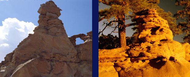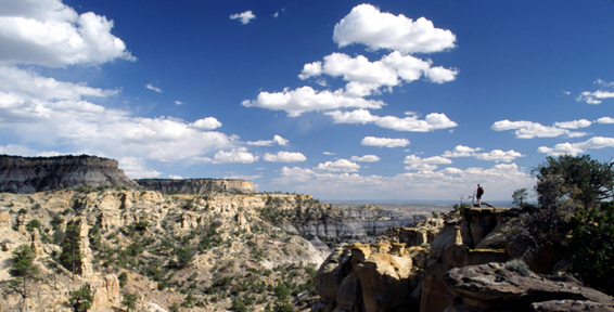 LYBROOK BADLANDS BY MICHAEL RICHIE FROM: “Lybrook Badlands,” New Mexico Magazine , Nov. 2004, with 2 color photos. AND: “The Lybrook Badlands,” Inside/Outside Southwest Magazine published by the Durango Herald , July/August 2007, with 5 color photos. Walking the mesa edge in Lybrook badlands is a trip through a superbly xeriscaped, avant garde sculpture park with exhilarating aerial views. It’s also a very sinuous path. Long, thin sandstone fingers stretch out across crumbling grey hoo doo galleries below. The colorful sandstone rim itself sports the most diverse collection of precariously balanced, red cap-rocked hoo doos I’ve ever seen. These aerodynamically designed sculptures ranging in size from monumental to petite are so ingeniously shaped that they appear created in a Santa Fe studio rather than by natural forces. Character laden, bonsai ponderosa and picturesque old junipers clinging to bare rock greatly enhance the artwork. My first visit several years ago to the Lybrook badlands brought astonishment tinged with embarrassment. I’d passed through Lybrook Village on 550 south of Bloomfield numerous times over the years with no inkling that anything like this lay less than a mile from the highway. After many return trips, Lybrook has become my favorite San Juan Basin Badland. I’ve been exploring, photographing, and writing about north western New Mexico’s badlands since first visiting the Bisti back in 1980. I published the first article on the Bisti for a national audience in 1982 in Sierra Magazine when the fight to stop the strip mining and get it declared wilderness was gaining momentum. The Bisti was saved, became world renown, and I have always been proud to have contributed. So it’s not without a little guilt that I say the virtually unknown Lybrook badlands eclipse the Bisti both in scenic and recreational appeal. Larger in size, they surpass the Bisti in the complexity of their multi-level topography, in the variety of hoo doo styles and coloration, and certainly in the beauty of the pygmy conifer forests which add so much color and detail to the hikes. If the Bisti represents an abstract, other worldly dreamscape then Lybrook is a well-designed, lavishly landscaped sculpture garden. It offers grandeur and rugged cross country hiking, but also numerous, shaded alcoves and intimate galleries showcasing the smaller scale statuary and superb trees. Lybrook’s box canyon riddled mesas drop over 700 feet in four distinct stair steps. Carved from a widespread San Juan Basin rock layer sequence known to geologists as the Nacimiento Formation, these multicolored sandstone, mudstone, and shale layers began forming about 63 million years ago and span 10 million years of earth history. The ancient layers’ diversity are responsible for the scenic variety at Lybrook and reflect the rich environments and biological communities that existed in the San Juan basin long ago. The Nacimiento layers started forming during the Paleocene Period in early Tertiary times. The dinosaurs had vanished and early mammals were gaining a foothold in the basin’s lush forested floodplains. Erosion from the rapidly rising San Juan Mountains to the north produced huge amounts of sediments transported by rivers and dumped into the basin. The resulting maze of forested river deltas, meandering streams, wetlands, bogs, and freshwater lakes left plentiful mammal fossils, along with widespread petrified wood caches. Periodic volcanic ash showers from the rapidly rising San Juan Mountains brought extra silicates and colorful minerals greatly enriching the ever thickening deposits that would later become the perfect medium for nature’s sculpting prowess. The excellent fossil record at Lybrook shows that mammals were still small and vulnerable. The top predator at the time was a fearsome 10 feet tall flightless bird with vicious beak and massive claws called the Diatryma. The Nacimiento Formation tells a detailed and interesting story about ancient environments, but it’s just one chapter from a whole novel written in the ten sequential sedimentary layers underlying the San Juan Basin. This gentle depression has been collecting sediments for about 160 million years since the middle dinosaur age. A few relatively large time gaps interrupt the resulting 2 mile thick sedimentary layer cake, but beginning about 100 million years ago, a nearly continuous record of ancient environments is preserved in the stacked layers, or “formations”, up until about 40 million years ago. The basin didn’t take its saucer-like shape until 20 million years ago when widespread faulting, volcanism, and uplift along the boundary exposed older, underlying layer edges to the elements and accelerated erosion. One look at a color coded, regional geologic map presents a clear picture. Warped upward along their perimeters, the exposed, relatively thin layer edges form huge concentric circles with the oldest, bottom layers at the basin’s outer reaches and the youngest, topmost layers in the center. The Nacimiento Formation lies second from the top in the time sequence. Just above it, the most recent, topmost layer called the San Jose Formation actually forms a disk at the basin’s center. Two formations below and farther out from the center, the Bisti Badlands are carved from the 70 million year old, late Cretaceous Kirkland/Fruitland formation deposited when the last of the dinosaurs roamed the shores of a retreating inland sea. The Lybrook badland’s initial complexity reveals a fairly simple pattern. The stair step tops are formed from tough, red and orange sandstone, the sides from more easily eroded, grey mudstone and shale. These two rock types produce two distinct hoo doo types. Those along the sandstone mesa edges are more precisely carved, either into multi-colored, striated domes and hoo doo clusters, with occasional arches, or solitary columns balancing intricately defined cap rocks. While below, the