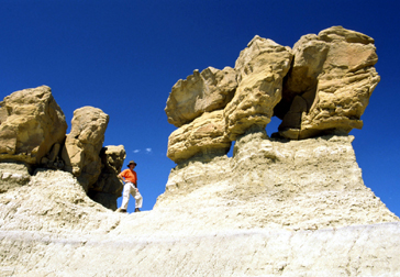 Formation Name: NACIMIENTO Rock Type(s): Sandstone alternating with Siltstone and Shale Geologic Time Period: TERTIARY-- MIDDLE PALEOCENE Time of Deposition (in millions of years ago): 65?, 64? to 58 Depositional Environment: Branching river systems and large flood plains Common Fossils Found: petrified wood, fish scales, early mammals (e.g., primates, dog-sized early hoofed varieties) Formation Name(s): SAN JOSE Rock Type(s): Conglomerate, Sandstone, Siltstone, Shale Geologic Time Period(s): TERTIARY--EARLY EOCENE Time of Deposition (in millions of years ago): 54 - 38 Depositional Environment: River systems, flood plains, wetlands Common Fossils Found: Petrified wood, fish scales, crocodiles, giant flightless birds, more advanced mammals (e.g., Eohippus – early precursor of horses) The Mesa De Cuba Badlands stretch for 10 miles along an amazingly convoluted mesa whose bottom half is formed from the Nacimiento formation and top from the slightly younger San Jose formation. Many deeply penetrating, branching dry washes filled with intricately sculpted formations turn the hike into a visit to an exotic city with winding lanes that pass countless bazaars and side alleyways filled with larger-than-life statues and lavishly decorated buildings. Walking into and out of every wash would involve 4-5 actual miles for each linear mile traveled. Exploring the washes can be challenging as they narrow and become increasingly steep requiring hand over hand climbing. Petrified wood is strewn everywhere in various sized pieces and full-fledged logs. Huge, perfectly round, rust colored stones called iron concretions, some up to 5 feet across, lie scattered like forgotten marbles. MESA DE CUBA DIRECTIONS — Turn west onto paved NM 197 just south of Cuba village. Follow it around the mesa’s southern edge for about 5.5 miles to a small dirt road on the right. The route heads north for about 4 miles up the mesa’s west side. Public lands extend the whole way so you can stop anywhere the going looks good and hike over to the mesa base. FOR MORE INFO-- Donna Dudley, Recreation specialist at the Albuquerque BLM office, 761-8700 |