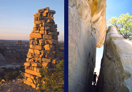 Formation Name: NACIMIENTO Rock Type(s): Sandstone alternating with Siltstone and Shale Geologic Time Period: TERTIARY-- MIDDLE PALEOCENE Time of Deposition (in millions of years ago): 65?, 64? to 58 Depositional Environment: Branching river systems and large flood plains Common Fossils Found: petrified wood, fish scales, early mammals (e.g., primates, dog-sized early hoofed varieties) A classic Nacimiento badland, sprawling Penistaja Mesa lies just east of Ceja Pelon. It has an extremely complex perimeter surrounded by dozens of equally complicated smaller mesas and buttes. The end result is a formation filled canyon labyrinth and miles of mesa edges carved into fantastically shaped cliffs hiding numerous hoodoo galleries. Isolated mesa tops shelter superbly landscaped natural botanical parks showcasing the incredible strength and beauty of New Mexico’s high desert vegetation. Huge petrified tree trunks decorate the canyon bottoms. And then there are the three mysterious stone cairns spaced about a half mile apart along a straight line across the very irregular mesa edge. Carefully constructed in a morterless style reminiscent of the ancient Anasazi pueblos, each is over 8 feet tall with four feet wide bases. No record of them exists in any archaeological data bases. They could be anything from markers for a pre-Colombian trade route to entertainment for bored Spanish sheep herders, but they sure add food for thought on any Penistaja mesa hike. PENISTAJA DIRECTIONS - Turn onto highway 197 just south of Cuba and travel about 9 miles west to a right turn onto a well maintained dirt road and continue west for about 7.5 miles to another right turn onto a smaller dirt branch. A tall, light colored metal tank to the north marks this turn. You are now headed in a northerly direction for about 1.5 a miles over the top of small hill where the badlands formations appear on the right side of the road. Stop any where and walk east into the badlands. FOR MORE INFO-- Donna Dudley, Recreation specialist at the Albuquerque BLM office, 761-8700 |