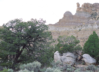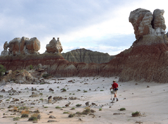SAN JOSE BADLANDS Formation Name(s): SAN JOSE Rock Type(s): Conglomerate, Sandstone, Siltstone, Shale Geologic Time Period(s): TERTIARY--EARLY EOCENE Time of Deposition (in millions of years ago): 54 -38 Depositional Environment: River systems, flood plains, wetlands Common Fossils Found: Petrified wood, fish scales, crocodiles, giant flightless birds, more advanced mammals (e.g., Eohippus – early precursor of horses) The San Jose Badlands lie in the youngest and topmost San Jose formation which forms a disk at the basin center instead of a ring. This San Jose formation was deposited beginning about 54 million years ago during Eocene times when mammal evolution was really gaining momentum. The San Jose badlands are composed mainly of softer siltstone and shale. Scattered hoo doos are less numerous,larger, and more ingenious looking.Baroque textures, fractal erosion patterns, andNavajo blanket colors provide plenty of visual excitement. Mammal fossils are common and Anasazi pottery shards, arrow heads and flint chips lie scattered along the forested ridgeline. The road in follows an east-west tending spur of formations to the continental divide where the main north-south escarpment is carved into purple-banded castle turrets and elegant towers. Occasional petrified logs protrude from cliff faces and mammal fossils wash out of hillsides. SAN JOSE BADLANDS DIRECTIONS --About 3 miles north of Cuba turn east off 550 onto State Highway 96 and continue about 12 miles north past Regina village to the junction with County Road 112. Take 112 north less than 2 miles miles and turn left or west onto dirt county road 0391. Badland formations line the route all along the north side of the road for the 3 mile drive to the parking area at the continental divide ridgeline, which is also the boundary of Santa Fe National Forest. The best hoo doo gardens and box canyons are carved into the east face of the north-south continental divide ridgeline for miles to the north of the parking pull off. FOR MORE INFO-- Donna Dudley, Recreation specialist at the Albuquerque BLM office, 761-8700 |